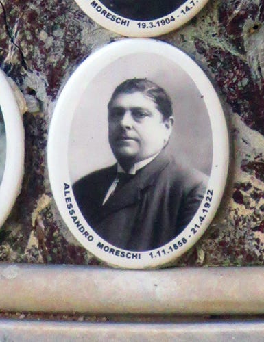 Moreschi s-a retras într-un apartament aflat pe Via Plinio nr. 19, în apropiere de Vatican, unde a murit pe 21 aprilie 1922, la vârsta de 63 de ani, posibil din cauza unei pneumonii. Slujba de înmormântare, desfășurată la Biserica San Lorenzo in Damaso, a fost un eveniment de mare amploare, artistul fiind condus într-o procesiune impresionantă la Cimitirul Verano, „orașul morților”, aflat nu departe de gara Tiburtina din Roma.