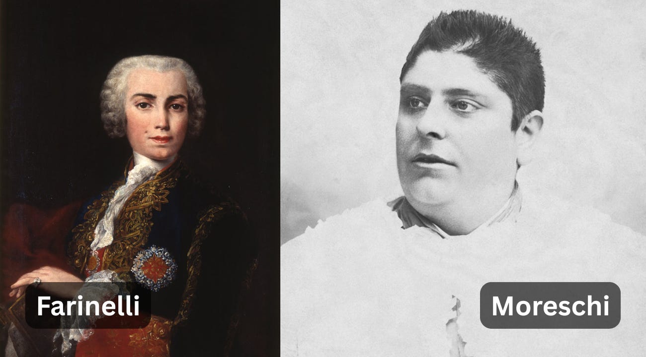 Printre cei mai cunoscuți castrați se numără Carlo Broschi, al cărui nume de scenă a fost Farinelli. Născut pe 24 ianuarie 1705, într-o familie de mici nobili din sudul Italiei, Broschi a fost un adevărat fenomen al epocii: poseda o voce extraordinar de flexibilă, pură și amplă, cu un ambitus de peste trei octave, reușind să treacă cu ușurință de la registrul baritonal până la cel de soprană. La doar 20 de ani, era idolul scenelor lirice europene, prieten al marilor nobili și al capetelor încoronate și simbol de neconstestat al operei baroce.