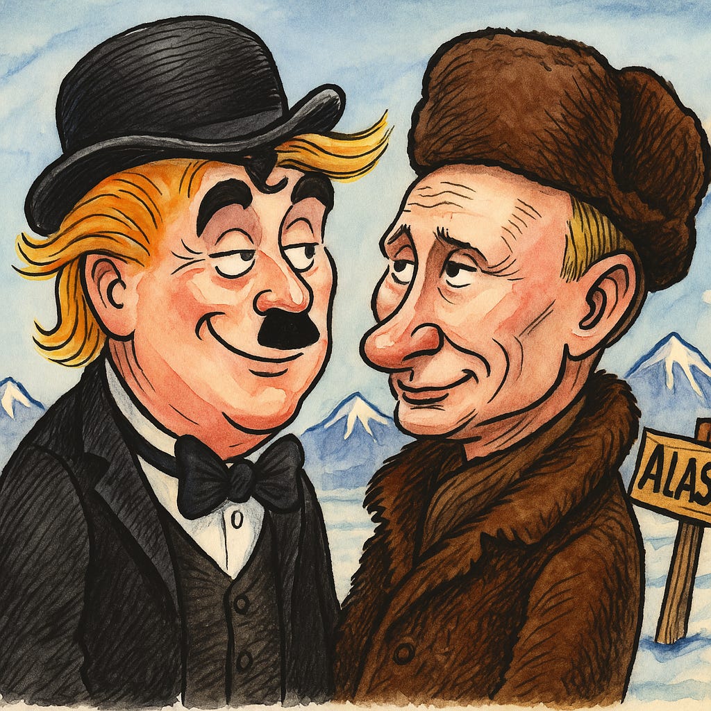 Privit printr-o lentilă cinematografică, summitul din Alaska ar fi putut trece drept o scenă pierdută din “Goana după aur”, doar că, de data aceasta, „Vagabondul” nu era cel cu baston și joben, ci Trump însuși: personajul care umple scena cu gesturi mari și vorbe colorate, dar care, la final, pleacă tot flămând, fără niciun „acord” real. În fața lui, Putin joacă mai degrabă rolul minerului, care nu dezvăluie nimic despre comoara pe care ar putea sau nu să o dețină.